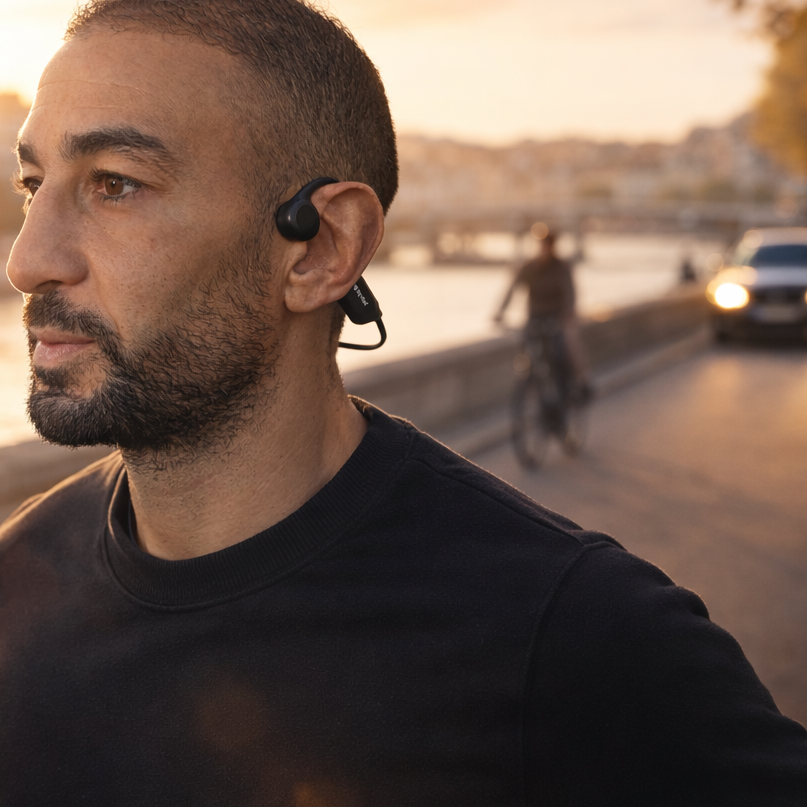 Contrairement aux écouteurs classiques, Is Good ne bloque pas vos tympans. Grâce à la conduction osseuse, le son est transmis par de légères vibrations à travers les os de la mâchoire, directement vers l’oreille interne. Le résultat est immédiat : vous profitez de votre musique avec une clarté surprenante, tout en restant parfaitement attentif à votre environnement. Voitures, piétons, bruits de la nature… rien ne vous échappe.